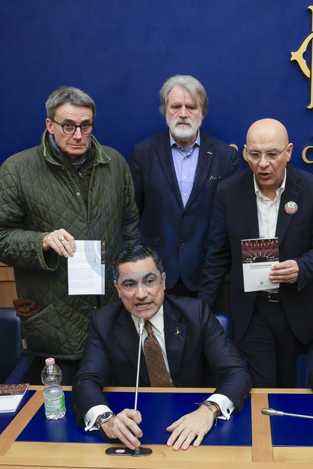January 30, 2026, Rome. Protests erupted at the Remigration and Reconquest Committee press conference in the Chamber of Deputies Press Room. The conference was later canceled for security reasons. Pictured is Lega MP Domenico Furgiuele, being protested by center-left MPs., Credit:Richard De Luca / Avalon