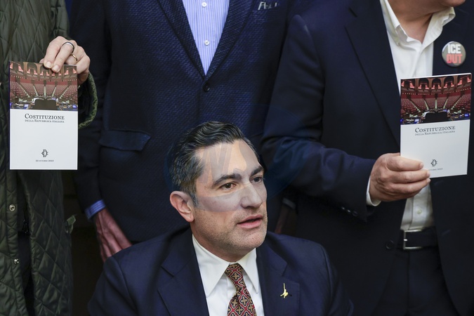 January 30, 2026, Rome. Protests erupted at the Remigration and Reconquest Committee press conference in the Chamber of Deputies Press Room. The conference was later canceled for security reasons. Pictured is Lega MP Domenico Furgiuele, being protested by center-left MPs., Credit:Richard De Luca / Avalon