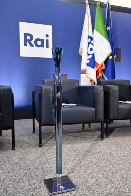 January 30, 2026, Rome. Rai. Press conference to present the XXV Olympic Winter Games Milan-Cortina. Pictured is one of the two Olympic torches for the Milan-Cortina 2026 Winter Olympics., Credit:Maria Laura Antonelli / Avalon