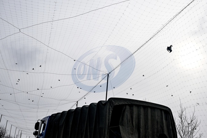 Birds fly past a pigeon stuck in an anti-drone net, Donetsk region, Ukraine, January 23, 2026., Credit:Dmytro Smolienko / Avalon