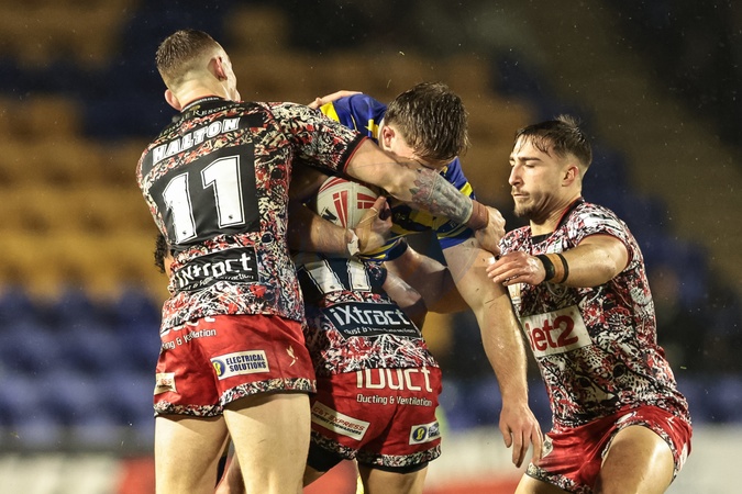 Luke Thomas of Warrington Wolves is tackled by Liam Horne of Leigh Leopards during the Pre Season match Warrington Wolves vs Leigh Leopards at Halliwell Jones Stadium, Warrington, United Kingdom, 30th January 2026, Credit:Mark Cosgrove/News Images / Avalon