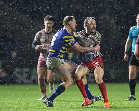 Gareth O'Brien of Leigh Leopards is tackled by Ben Currie of Warrington Wolves during the Pre Season match Warrington Wolves vs Leigh Leopards at Halliwell Jones Stadium, Warrington, United Kingdom, 30th January 2026, Credit:Mark Cosgrove/News Images / Avalon