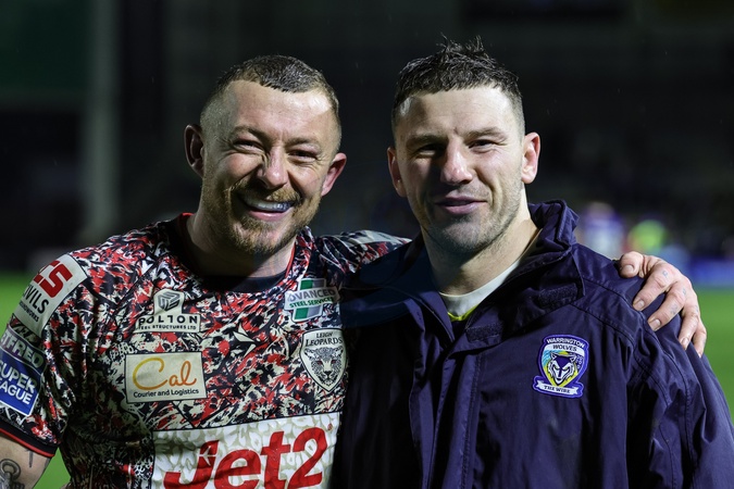 Josh Charnley of Leigh Leopards and George Williams of Warrington Wolves during the Pre Season match Warrington Wolves vs Leigh Leopards at Halliwell Jones Stadium, Warrington, United Kingdom, 30th January 2026, Credit:Mark Cosgrove/News Images / Avalon