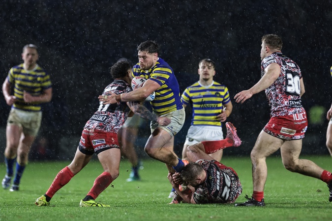 Joe Philbin of Warrington Wolves breaks with the ball during the Pre Season match Warrington Wolves vs Leigh Leopards at Halliwell Jones Stadium, Warrington, United Kingdom, 30th January 2026, Credit:Mark Cosgrove/News Images / Avalon