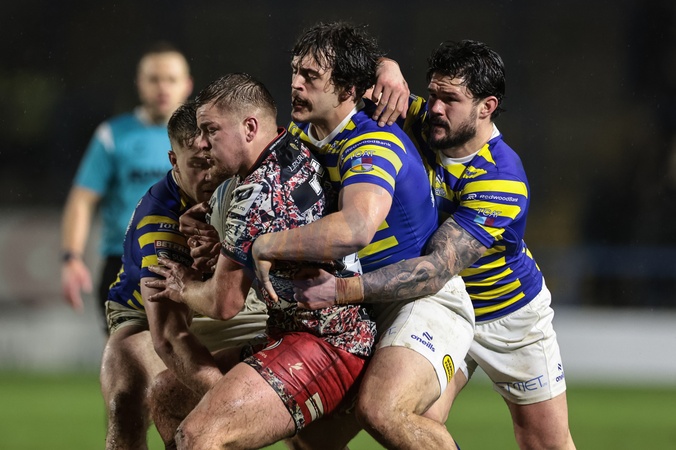 Max Wood of Warrington Wolves and James Bentley of Warrington Wolves Luke Thomas of Warrington Wolves in action during the Pre Season match Warrington Wolves vs Leigh Leopards at Halliwell Jones Stadium, Warrington, United Kingdom, 30th January 2026, Credit:Mark Cosgrove/News Images / Avalon