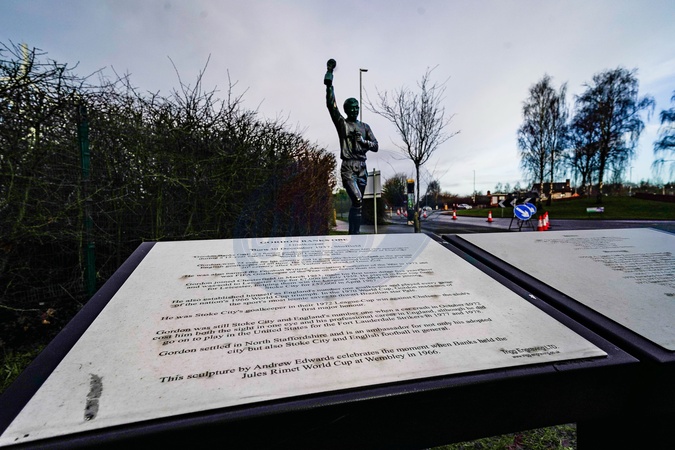 A general view of the Gordon Banks OBE statue outside the stadium during the Sky Bet Championship match Stoke City vs Southampton at Bet365 Stadium, Stoke-on-Trent, United Kingdom, 31st January 2026, Credit:Maynard Manyowa/News Images / Avalon