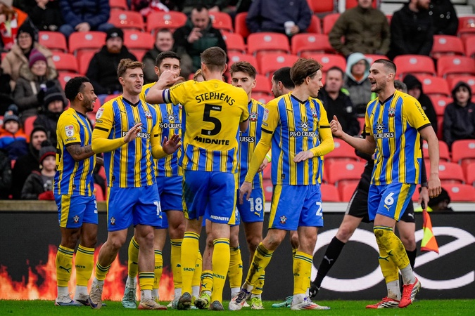 Jack Stephens of Southampton celebrates Flynn Downes of Southampton scoring a goal to make it 0-2 during the Sky Bet Championship match Stoke City vs Southampton at Bet365 Stadium, Stoke-on-Trent, United Kingdom, 31st January 2026, Credit:Maynard Manyowa/News Images / Avalon