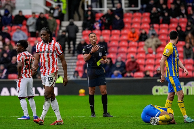 Referee Farai Hallam gives a yellow card to Bosun Lawal of Stoke City during the Sky Bet Championship match Stoke City vs Southampton at Bet365 Stadium, Stoke-on-Trent, United Kingdom, 31st January 2026, Credit:Maynard Manyowa/News Images / Avalon