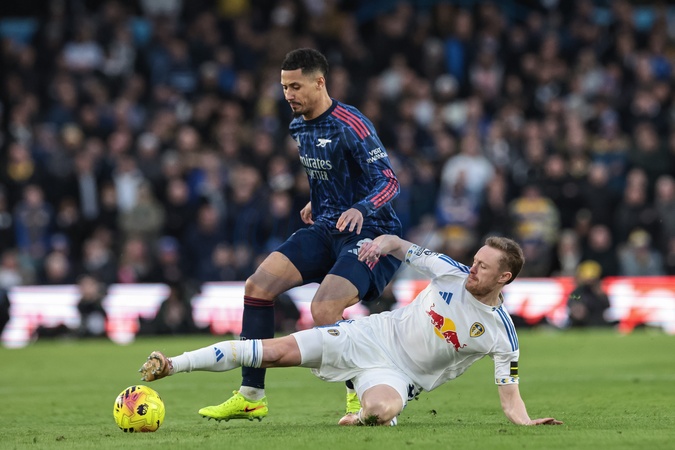 Sean Longstaff of Leeds United slide tackles William Saliba of Arsenal during the Premier League match Leeds United vs Arsenal at Elland Road, Leeds, United Kingdom, 31st January 2026, Credit:Mark Cosgrove/News Images / Avalon
