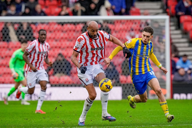 Steven Nzonzi of Stoke City battles for the ball with Tom Fellows of Southampton during the Sky Bet Championship match Stoke City vs Southampton at Bet365 Stadium, Stoke-on-Trent, United Kingdom, 31st January 2026, Credit:Maynard Manyowa/News Images / Avalon