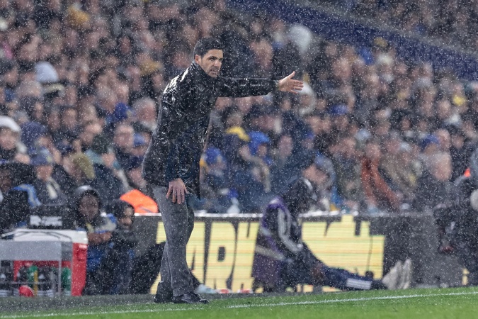 Mikel Arteta manager of Arsenal reacts in the technical area as therein pours during the Premier League match Leeds United vs Arsenal at Elland Road, Leeds, United Kingdom, 31st January 2026, Credit:Mark Cosgrove/News Images / Avalon