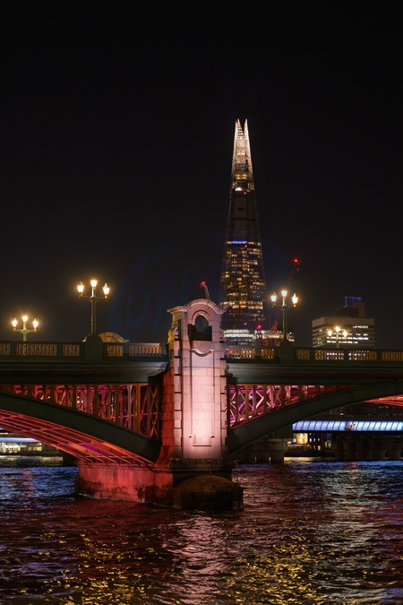 The Shard building seen by the River Thames at night in London.UK