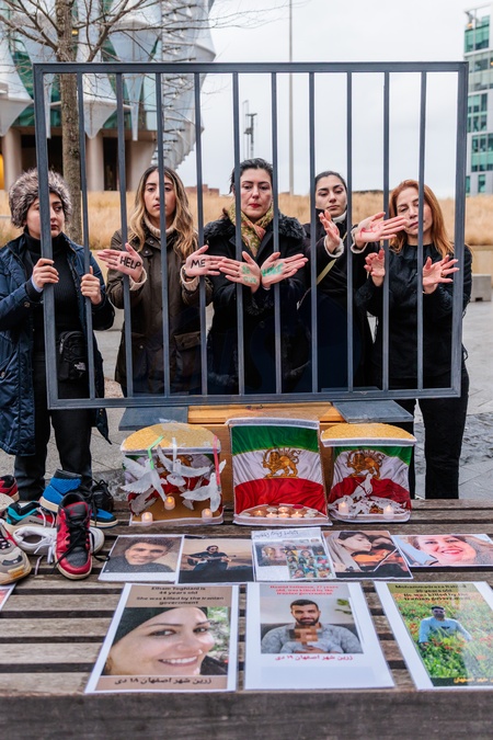 US Embassy, London, UK. 31st January 2026.Iranians joined former political prisoner, Nasrin Roshan, outside the US Embassy in London to highlight the arrests and executions of activists in Iran. Released from Evin Prison for the second time just over 7 months ago, Roshan is demonstrating on behalf of Evin prisoners on the silence by governments worldwide on the mass killings by the Islamic Republic and calling for US President Trump to keep his promise to support Iran., Credit:Photo by Amanda Rose / Avalon