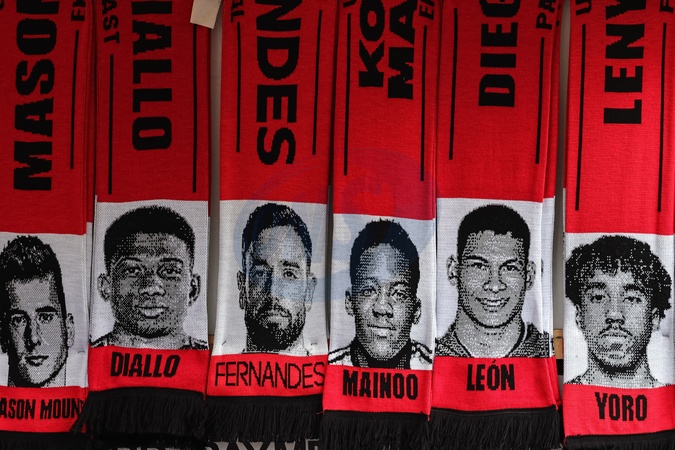 Manchester United scarfs on sale during the Premier League match Manchester United vs Fulham at Old Trafford, Manchester, United Kingdom, 1st February 2026, Credit:Mark Cosgrove/News Images / Avalon