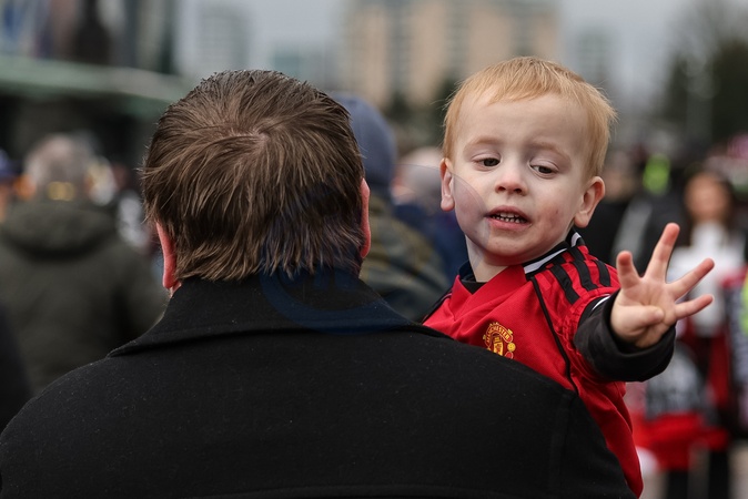 A young Manchester United fan waves during the Premier League match Manchester United vs Fulham at Old Trafford, Manchester, United Kingdom, 1st February 2026, Credit:Mark Cosgrove/News Images / Avalon