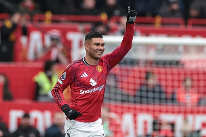 Casemiro of Manchester United celebrates his goal to make it 1-0 during the Premier League match Manchester United vs Fulham at Old Trafford, Manchester, United Kingdom, 1st February 2026, Credit:Mark Cosgrove/News Images / Avalon