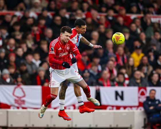 Neco Williams of Nottingham Forest wins a header in the air against Daniel Munoz of Crystal Palace during the Premier League match Nottingham Forest vs Crystal Palace at City Ground, Nottingham, United Kingdom, 1st February 2026, Credit:Ae Cosgrove/News Images / Avalon