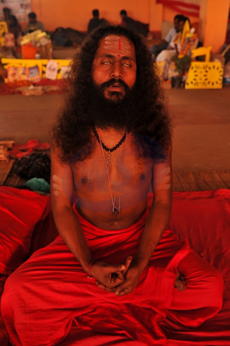 Chattogram, Bangladesh- A Hindu sadhu sits in deep meditation during the Rishi Kumbh Mela in Banshkhali, Chattogram, Bangladesh. Rishi Kumbh Mela is a major Hindu pilgrimage and cultural gathering held in the Rishi Dham area of Banshkhali Upazila, Chattogram, Bangladesh. Recognized as the country's only international Rishi Kumbh, the fair takes place approximately every three years and serves as a significant event for spiritual devotion, religious education, and social unity among Hindu communities., Credit:Md Rafayat Haque Khan / Avalon