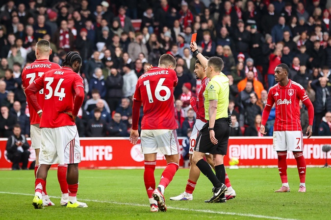 Referee Tony Harrington gives a red card to Neco Williams of Nottingham Forest during the Premier League match Nottingham Forest vs Crystal Palace at City Ground, Nottingham, United Kingdom, 1st February 2026, Credit:Ae Cosgrove/News Images / Avalon