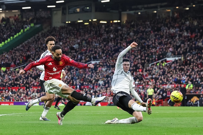 Matheus Cunha of Manchester United scores to make it 2-0 during the Premier League match Manchester United vs Fulham at Old Trafford, Manchester, United Kingdom, 1st February 2026, Credit:Mark Cosgrove/News Images / Avalon