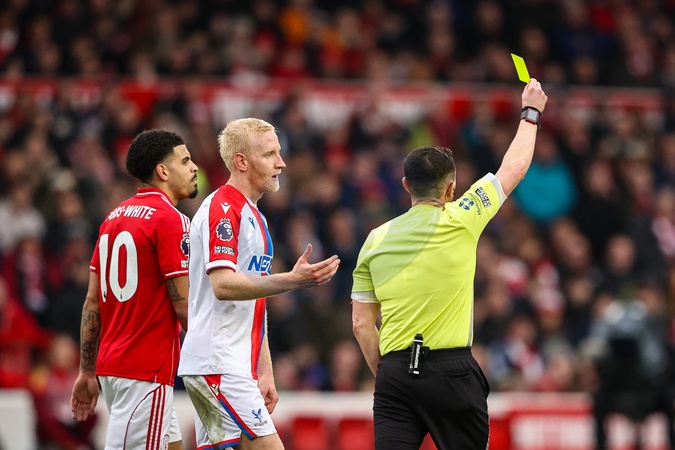 Referee Tony Harrington gives a yellow card to Nikola Milenkovic of Nottingham Forest during the Premier League match Nottingham Forest vs Crystal Palace at City Ground, Nottingham, United Kingdom, 1st February 2026, Credit:Ae Cosgrove/News Images / Avalon