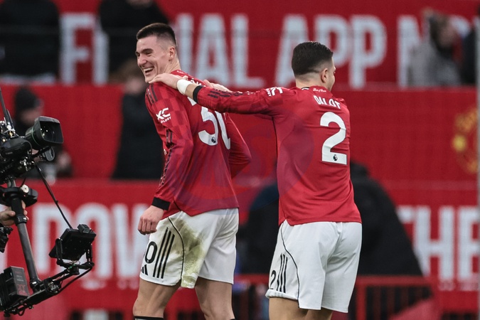 Benjamin Sesko of Manchester United and Diogo Dalot of Manchester United celebrate their 3-2 win during the Premier League match Manchester United vs Fulham at Old Trafford, Manchester, United Kingdom, 1st February 2026, Credit:Mark Cosgrove/News Images / Avalon