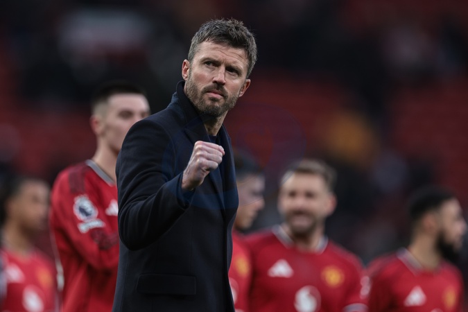 Michael Carrick manager of Manchester United celebrates the 3-2 win with the fans during the Premier League match Manchester United vs Fulham at Old Trafford, Manchester, United Kingdom, 1st February 2026, Credit:Mark Cosgrove/News Images / Avalon