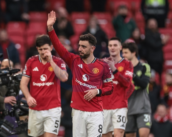 Bruno Fernandes of Manchester United applauds the fans during the Premier League match Manchester United vs Fulham at Old Trafford, Manchester, United Kingdom, 1st February 2026, Credit:Mark Cosgrove/News Images / Avalon
