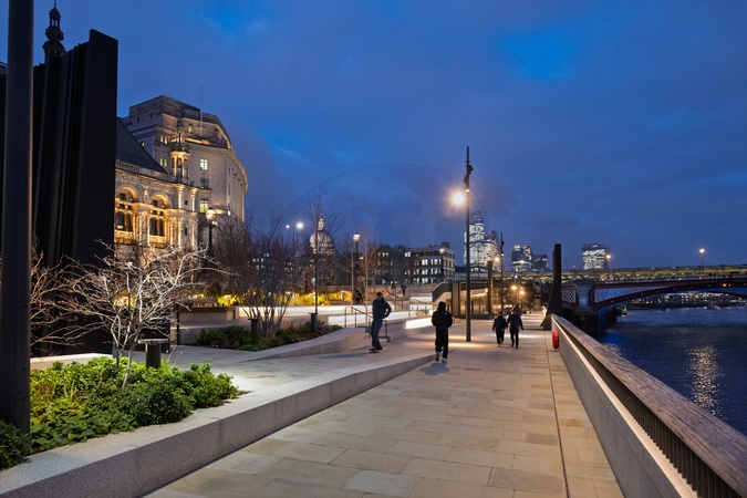 Bazalgette Embankment,adjacent to Victoria Embankment by Blackfriars bridge on the River Thames,a new piece of reclaimed land that hides the Tideway tunnel beneath. London. UK