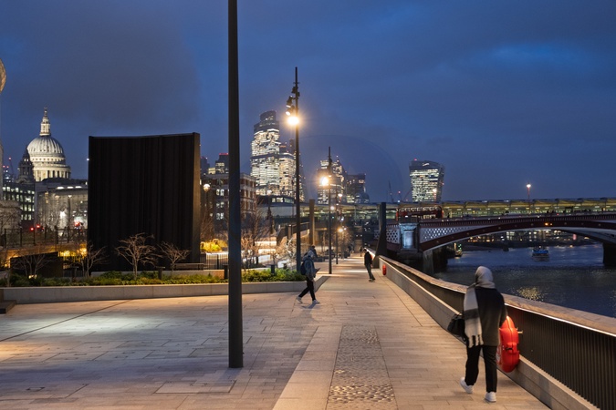 Bazalgette Embankment,adjacent to Victoria Embankment by Blackfriars bridge on the River Thames,a new piece of reclaimed land that hides the Tideway tunnel beneath. London. UK