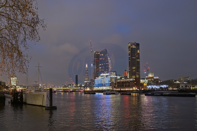 seen from adjacent to HMS Wellington, looking towards the South bank and Blackfriars bridge over the River Thames.London. United Kingdom. 01 January 2026, Credit:Mark Fairhurst / Avalon