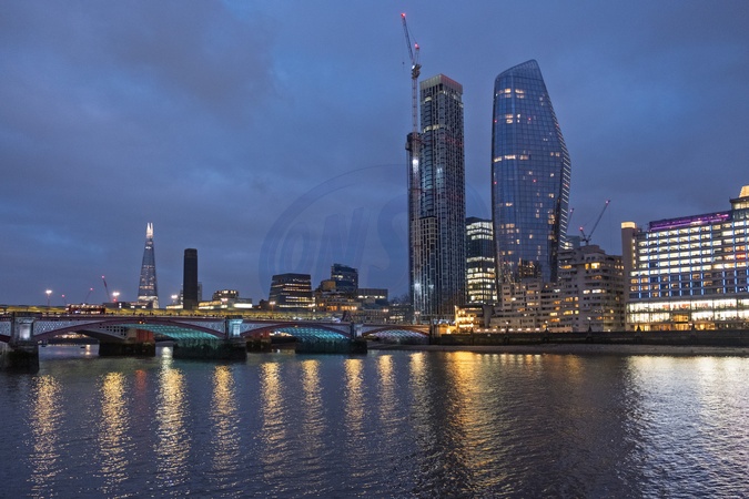 Looking across the River Thames from near HMS Wellington towards Blackfriars bridge and beyond to the Shard. London. UK