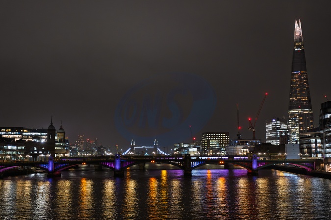 Looking eastwards along the River Thames towards Southwark bridge and Cannon street railway station,with Tower bridge and the Shard clearly visible. London. UK