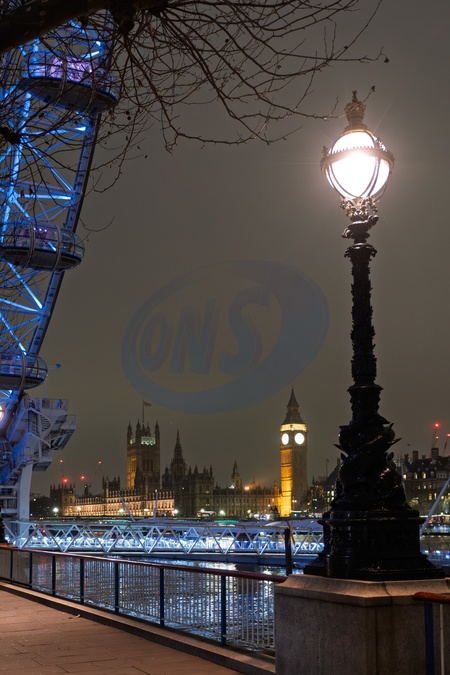 London Eye at night with the Houses of Parliament behind. London. UK