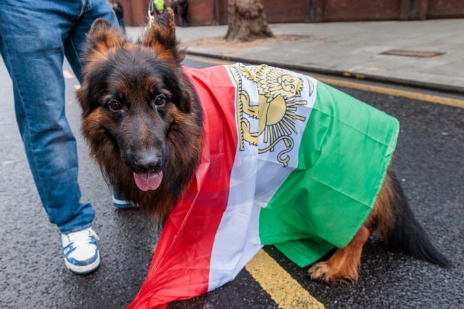 A growing group of four legged activists are spotted at the Iranian protests in London.In Iran, dogs are banned and even executed to protect "public order, health, and safety.” and their owners arrested.These 'Pooches for Pawlavi' joining their humans in the fight to free Iran from the Islamic Republic and bring back the Pahlavi Monarchy., Credit:Photo by Amanda Rose / Avalon