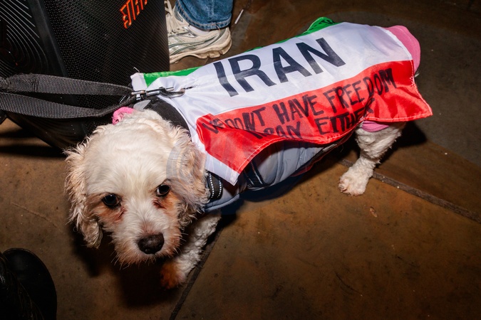 A growing group of four legged activists are spotted at the Iranian protests in London.In Iran, dogs are banned and even executed to protect "public order, health, and safety.” and their owners arrested.These 'Pooches for Pawlavi' joining their humans in the fight to free Iran from the Islamic Republic and bring back the Pahlavi Monarchy., Credit:Photo by Amanda Rose / Avalon