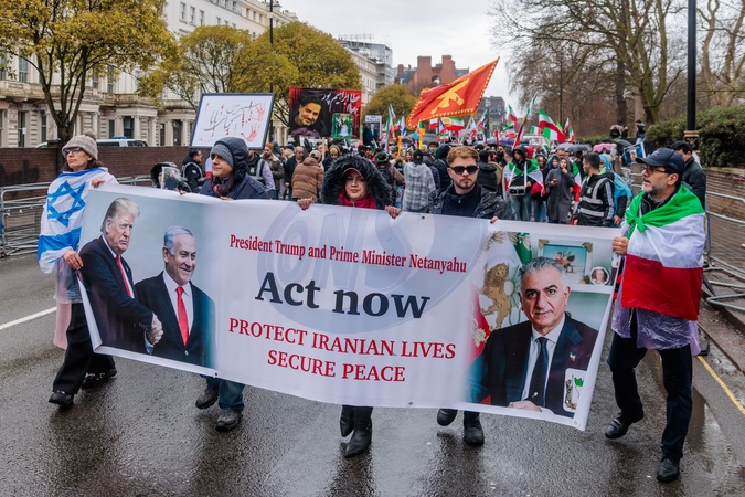 London, UK. 1st February 2026.The Iranian community and supporters march through London, waving Imperial Lion and Sun Iranian flags alongside GB Union Jack flags, Israeli flags and American flags, they are urging US President Trump to keep his promise to support the Iranian people against the violence and repression by the Islamic Republic regime and for the return of the Pahlavi Monarchy., Credit:Photo by Amanda Rose / Avalon