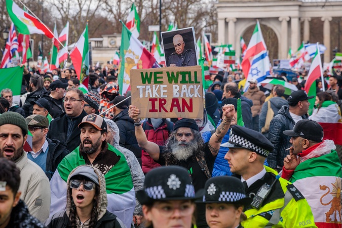 London, UK. 1st February 2026.The Iranian community and supporters march through London, waving Imperial Lion and Sun Iranian flags alongside GB Union Jack flags, Israeli flags and American flags, they are urging US President Trump to keep his promise to support the Iranian people against the violence and repression by the Islamic Republic regime and for the return of the Pahlavi Monarchy., Credit:Photo by Amanda Rose / Avalon