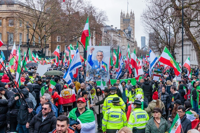 London, UK. 1st February 2026.The Iranian community and supporters march along Whitehall, waving Imperial Lion and Sun Iranian flags alongside GB Union Jack flags, Israeli flags and American flags, they are urging US President Trump to keep his promise to support the Iranian people against the violence and repression by the Islamic Republic regime and for the return of the Pahlavi Monarchy., Credit:Photo by Amanda Rose / Avalon