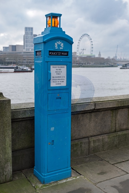 An unusual sight, an old disused City of London police telephone box,which could be used to communicate with the control room when radios were not in use. Victoria embankment. City of london. London, UK.