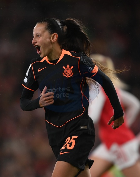 LONDON, ENGLAND - FEBRUARY 01: Belen Aquino of SC Corinthians celebrates her team's first goal, scored by teammate Gabi Zanotti (not pictured) during the FIFA Women's Champions Cup 2026 Final match between Arsenal Women FC and SC Corinthians at Arsenal Stadium on February 01, 2026 in London, England., Credit:TIM / SL / Avalon