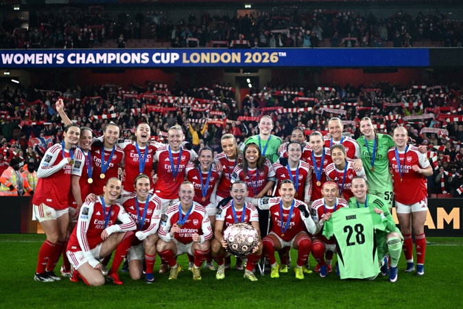 LONDON, ENGLAND - FEBRUARY 01: Arsenal players pose for a photo with the FIFA Women's Champions Cup Trophy following the FIFA Women's Champions Cup 2026 Final match between Arsenal Women FC and SC Corinthians at Arsenal Stadium on February 01, 2026 in London, England., Credit:JB1 / JB1 / Avalon