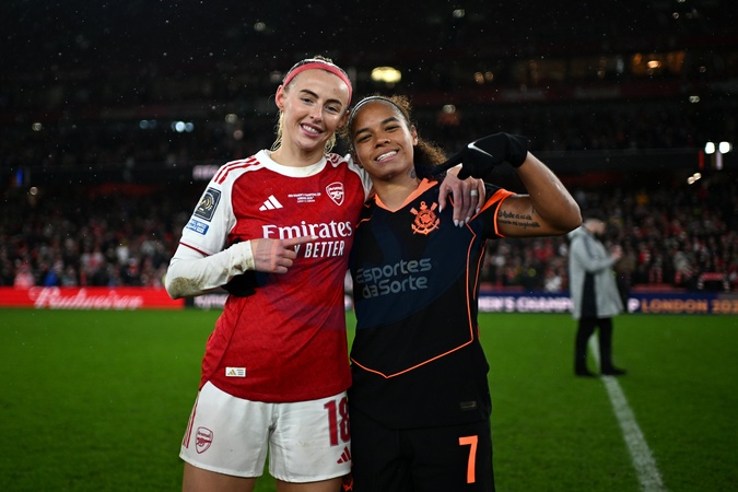 LONDON, ENGLAND - FEBRUARY 01: Chloe Kelly of Arsenal and Gisela Robledo of SC Corinthians embrace following the FIFA Women's Champions Cup 2026 Final match between Arsenal Women FC and SC Corinthians at Arsenal Stadium on February 01, 2026 in London, England., Credit:JB1 / JB1 / Avalon