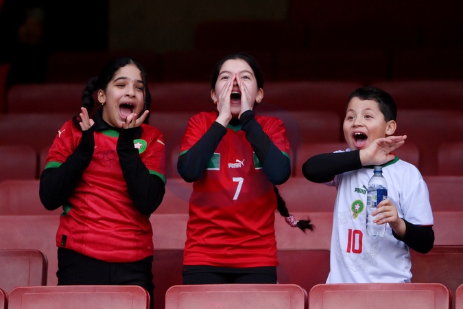 LONDON, ENGLAND - FEBRUARY 01: Fans wearing Morocco national shirts react as they show their support prior to the FIFA Women's Champions Cup 2026 Third Place Play Off match between ASFAR and Gotham FC at Arsenal Stadium on February 01, 2026 in London, England., Credit:RH / RH / Avalon