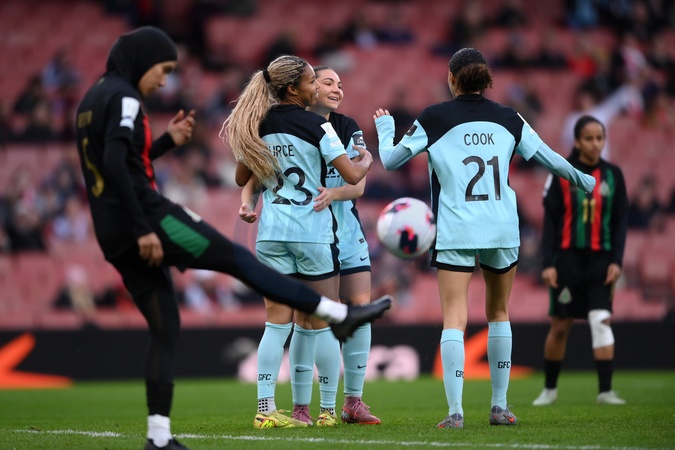 LONDON, ENGLAND - FEBRUARY 01: Midge Purce of Gotham FC celebrates scoring her team's fourth goal with teammate Khyah Harper during the FIFA Women's Champions Cup 2026 Third Place Play Off match between ASFAR and Gotham FC at Arsenal Stadium on February 01, 2026 in London, England., Credit:JB1 / SL / Avalon