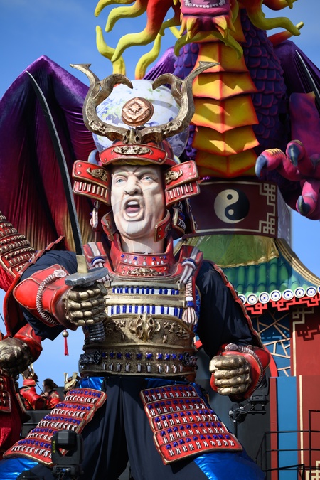 First masked parade of the Viareggio Carnival 2026. In the photo, the first category float "The Samurai of Power" by Luigi Bonetti with the masks of Trump, Putin and Xi Jinping dressed as samurai . Viareggio, Italy 01 Feb 2026, Credit:Stefano Dalle Luche / Avalon