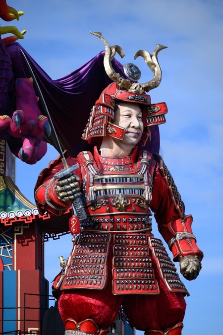First masked parade of the Viareggio Carnival 2026. In the photo, the first category float "The Samurai of Power" by Luigi Bonetti with the masks of Trump, Putin and Xi Jinping dressed as samurai . Viareggio, Italy 01 Feb 2026, Credit:Stefano Dalle Luche / Avalon