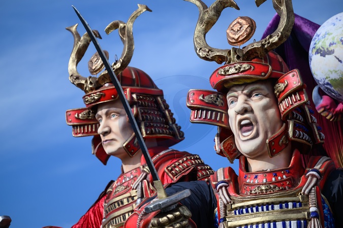 First masked parade of the Viareggio Carnival 2026. In the photo, the first category float "The Samurai of Power" by Luigi Bonetti with the masks of Trump, Putin and Xi Jinping dressed as samurai . Viareggio, Italy 01 Feb 2026, Credit:Stefano Dalle Luche / Avalon