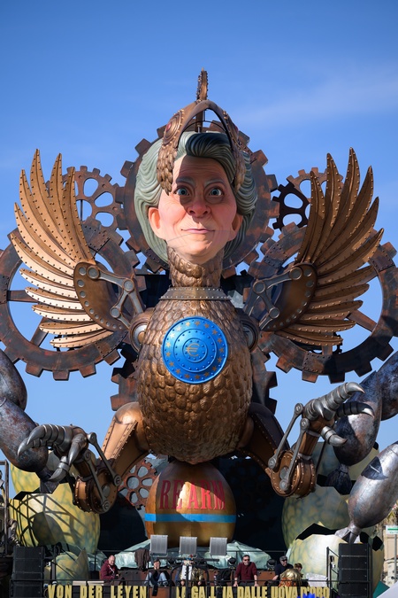 First masked parade of the Viareggio Carnival 2026. In the photo, the first category float "The hen that lays the golden eggs" by Alessandro Avanzini with the mask of the President of the European Union Ursula von der Leyen in the shape of a robotic hen. . Viareggio, Italy 01 Feb 2026, Credit:Stefano Dalle Luche / Avalon