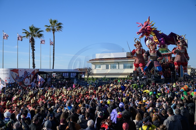 First masked parade of the Viareggio Carnival 2026. In the photo, the first category float "The Samurai of Power" by Luigi Bonetti with the masks of Trump, Putin and Xi Jinping dressed as samurai . Viareggio, Italy 01 Feb 2026, Credit:Stefano Dalle Luche / Avalon